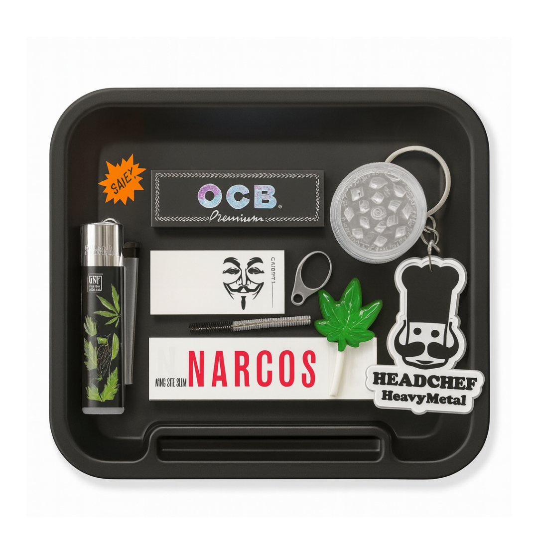 Featuring OCB Premium rolling papers, Narcos king-size papers, and high-quality accessories from Headchef, this all-black set embodies strength and style. Each piece is curated for functionality and durability, all presented on a glossy black rolling tray that completes the luxury look.