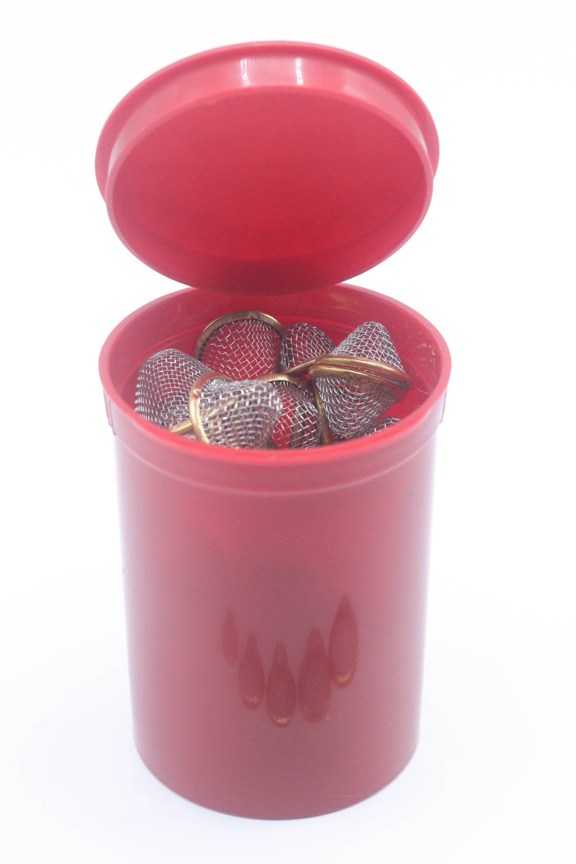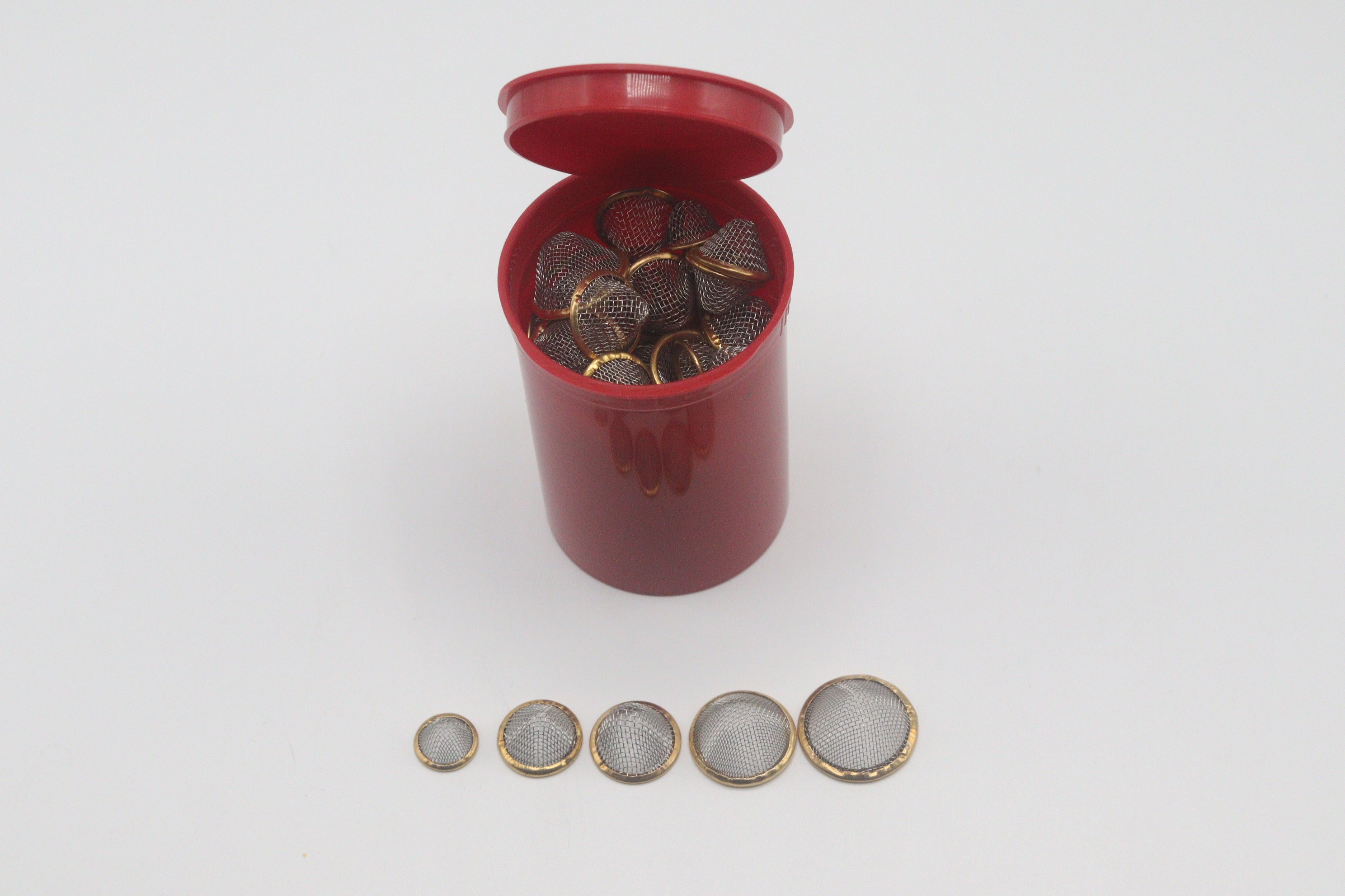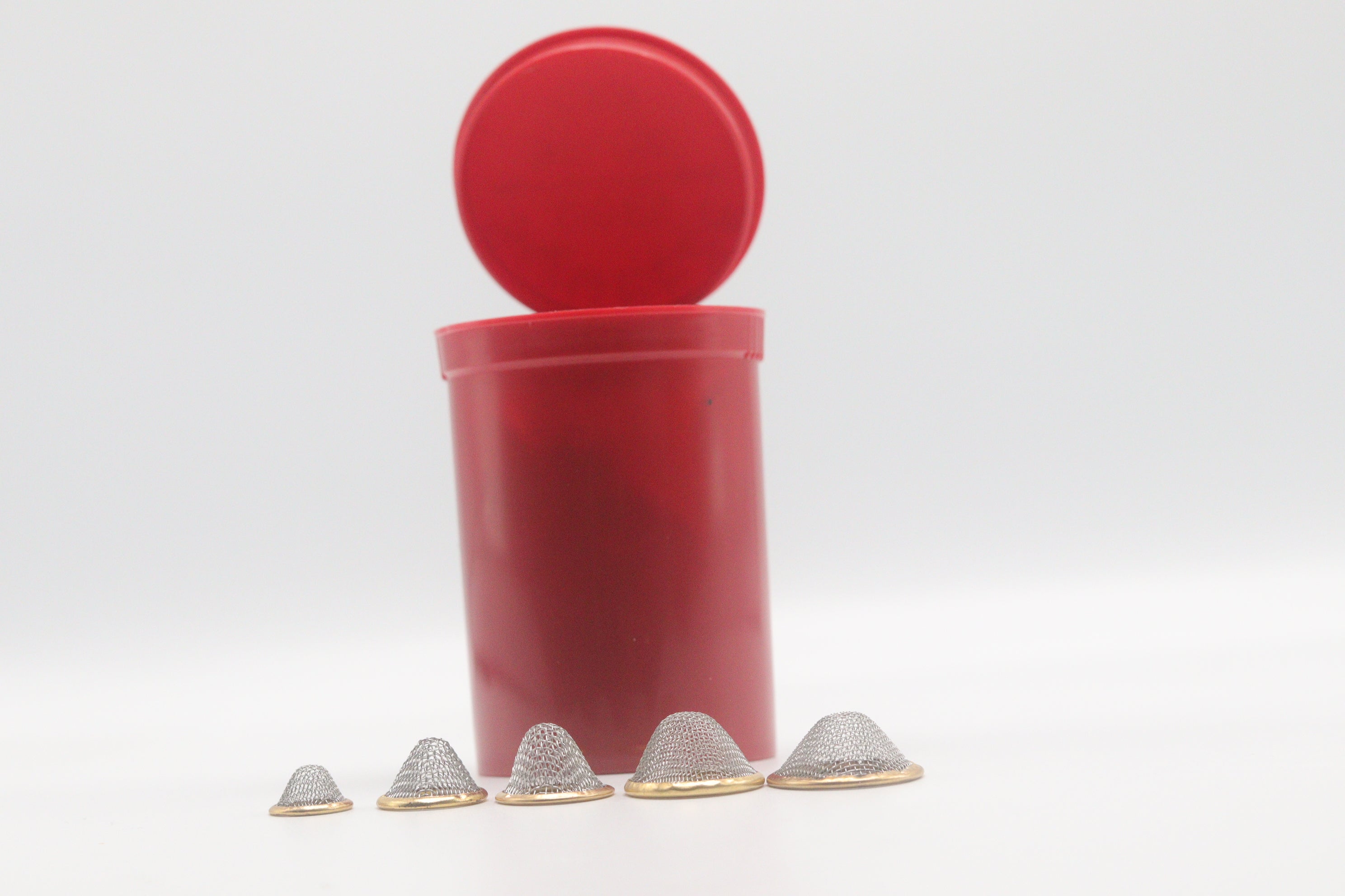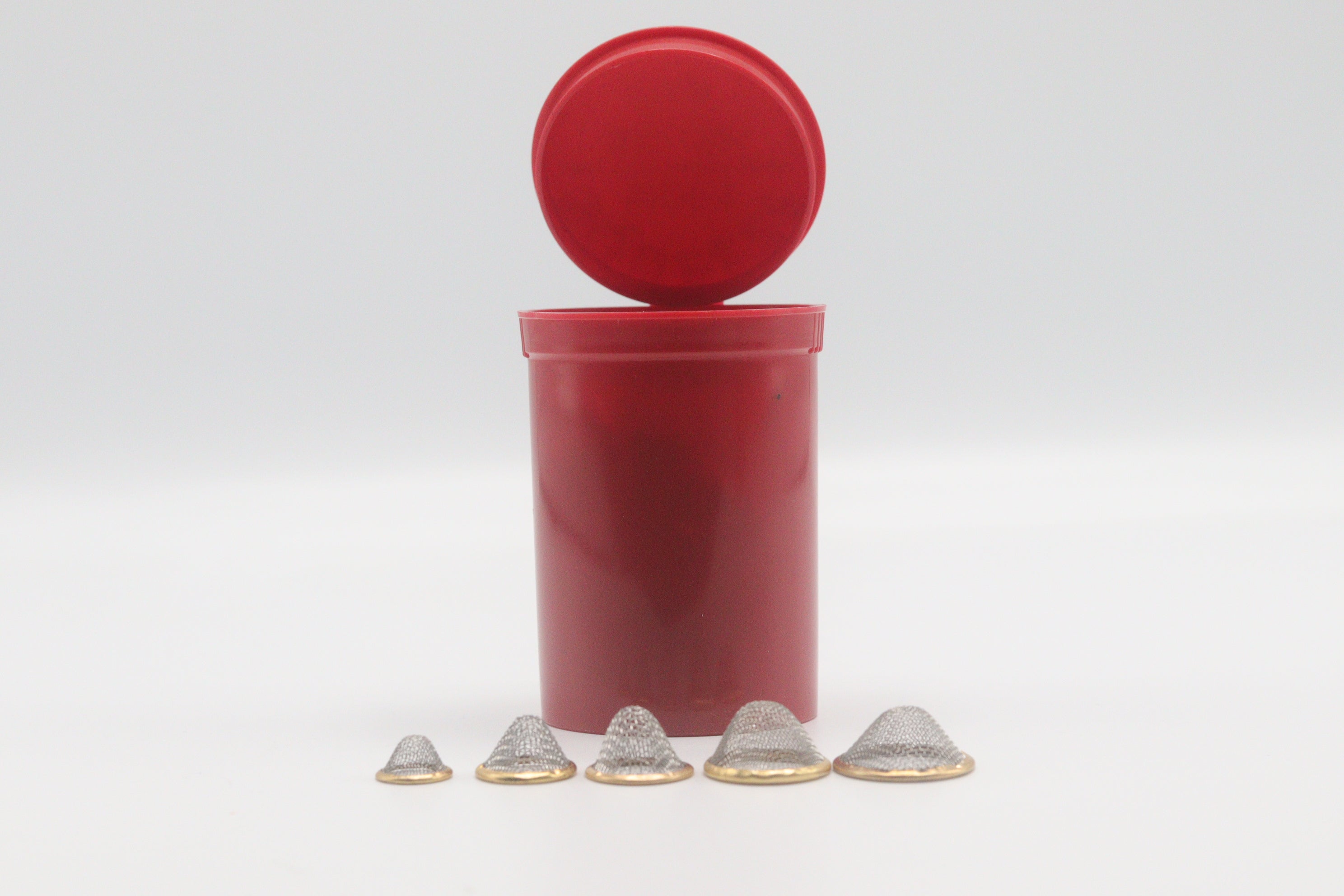 20pcs Conical Gauze Filter Screens | 12mm, 15mm, 17mm, 20mm, 22mm | Metal Mesh Filters in 30 Dram Pop Top Storage