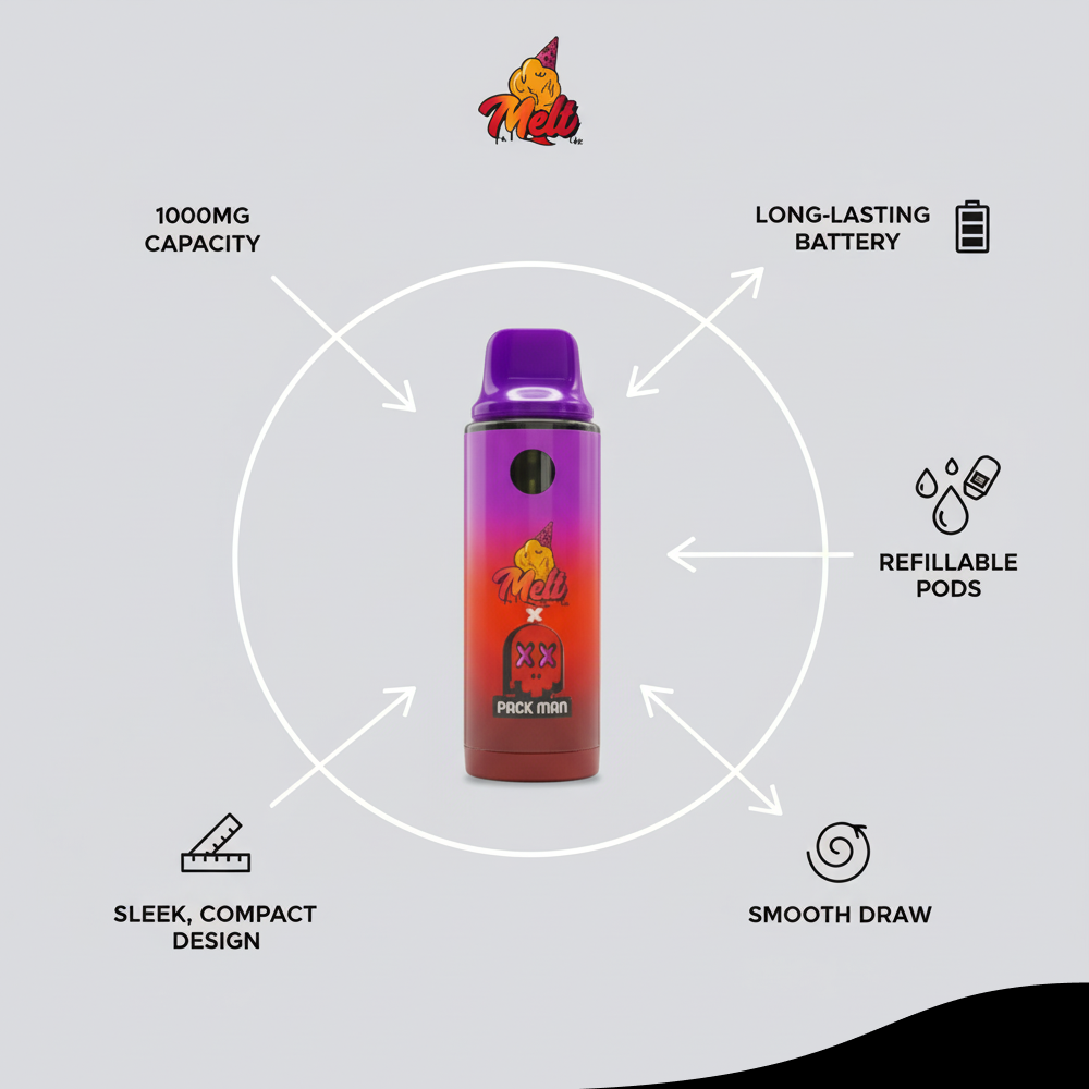 Experience next-level craftsmanship with the Melt & PACKMAN Liquid Diamonds + Live Resin V2 1G cartridge – designed for smooth, consistent performance and superior flavor. Featuring all-new premium packaging, this upgraded V2 model combines style, function, and reusability for the modern enthusiast.