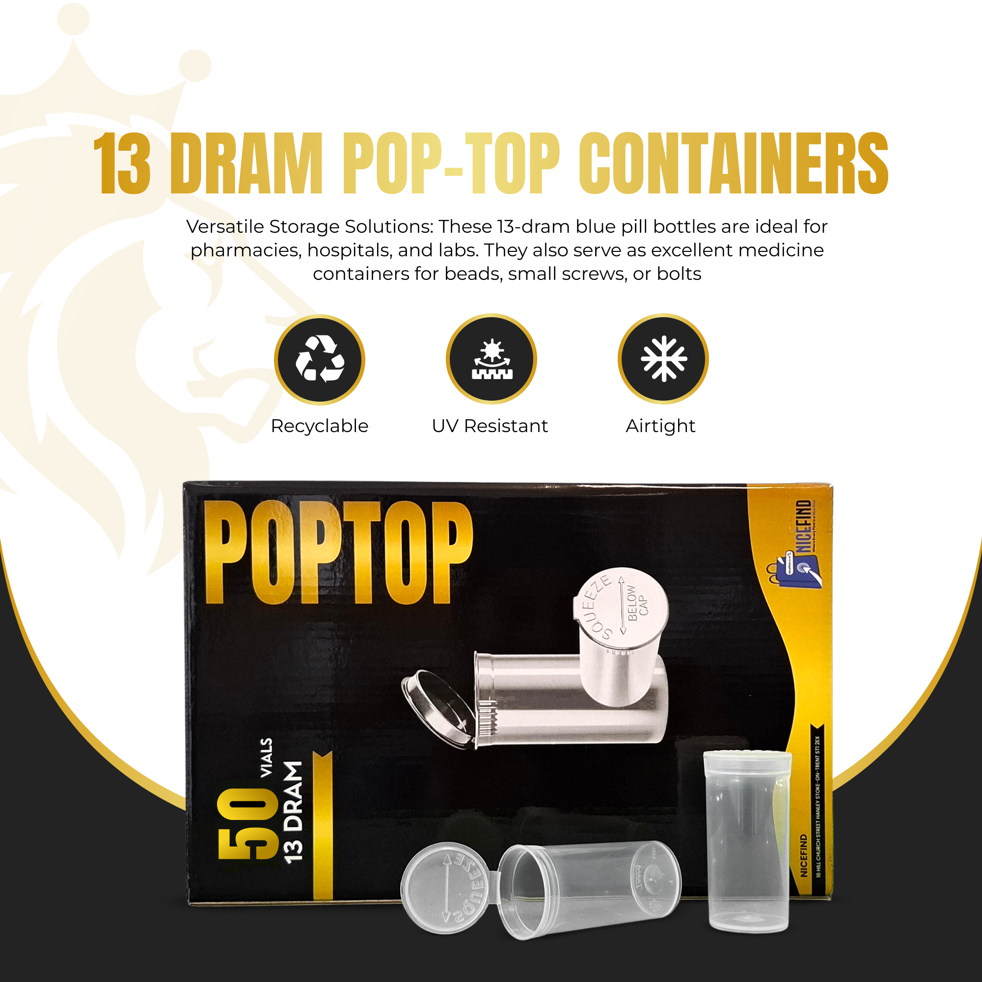 Upgrade your storage game with our Pop Top 13 Dram Containers medical grade plastic, premium quality, designed to combine safety, discretion, and convenience. Whether you're storing herbs, supplements, edibles, or other small items, these containers offer reliable, professional-grade packaging that keeps your contents fresh and protected.