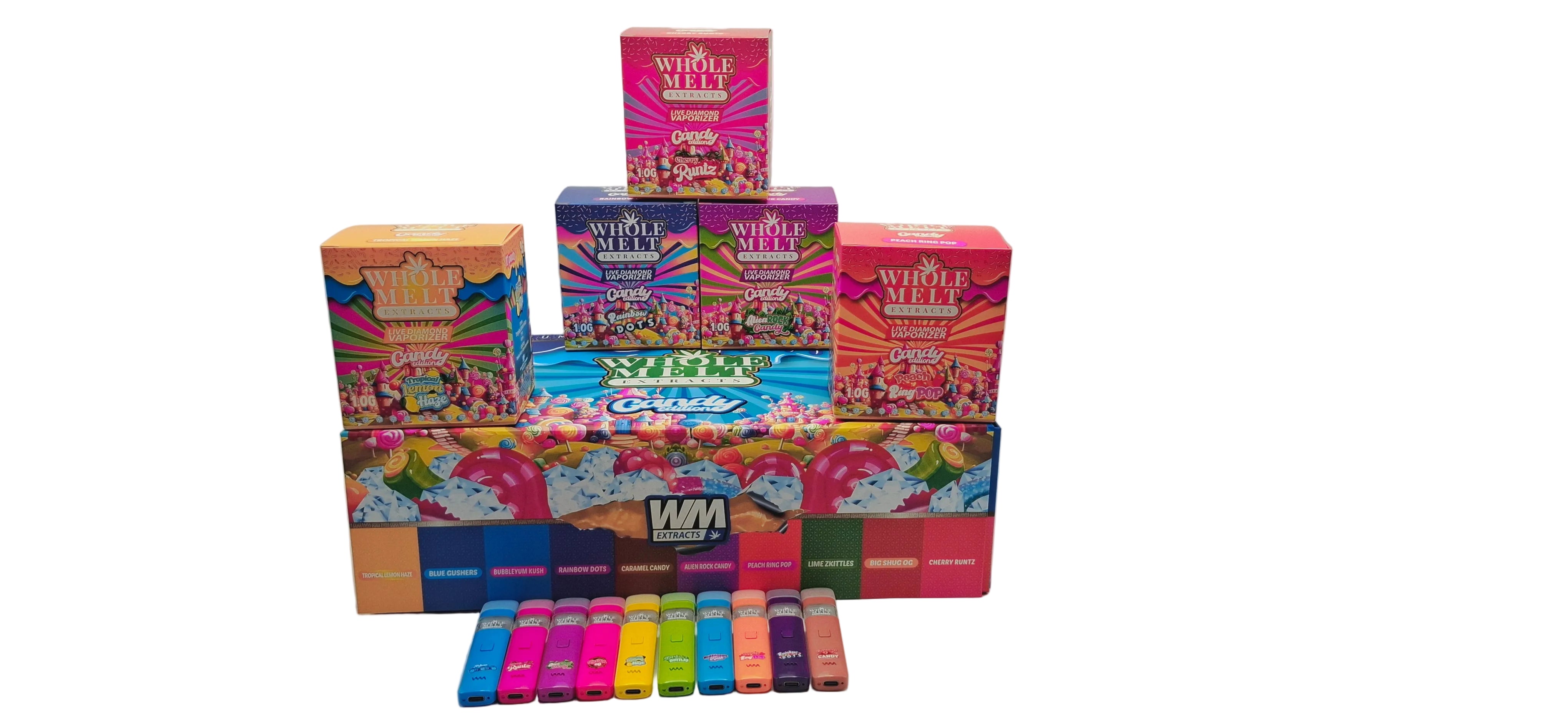 The Whole Melt Extracts Candy Edition Empty Cart Device is a premium 1.0G rechargeable hardware unit designed with vibrant candy-themed branding.